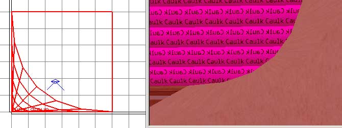 Duplicate the curve and cap for the four corners of the room and you will have a domed ceiling! But we're not done! Use the clip tool to cut your side walls so that you can caulk above the "curve line" - the line where your ceiling intersects the patches. Thus, you should end up with something like this: