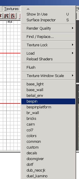 As you can see here, I have many texture sets that aren't included with Jedi Knight II. This is because Radiant will read the textures/ directory from any .pk3 you have in your GameData/base/ folder. If you download a map, its textures will appear here. Click on Bespin to load the Bespin texture set. These are all of the textures that Raven used in the SP (Single Player) Bespin levels and the MP (Multi Player) level ffa_bespin. You are free to reference any texture that was included with the game in your own levels. If you decide you want to use textures from a custom level, make sure you e-mail the level's authors and ask permission first. After the texture set loads (you will see it loading in the Status Bar (Section 5) at the bottom of the screen), you will notice that a WHOLE lot of textures have appeared in your Texture Browser. Since they all appear so big, go back up into the Texture Menu and select Texture Window Scale. This is where you set the visual size of the textures as they appear in the Texture Browser. I personally set this to 25% except when viewing extremely small textures. Select the brush you've been looking at and then click the "u_grate" texture (it's toward the end) from your texture window. Ta-da! Your box now looks like more of a box. (: